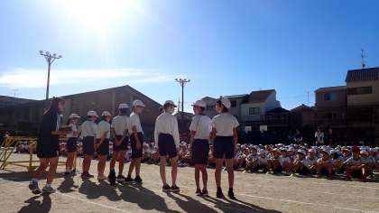 今日は、開会式・閉会式の練習と、児童席の確認をしました。開会宣言やスローガン発表、準備運動を兼ねた全校ダンスなどの流れを確認しました。