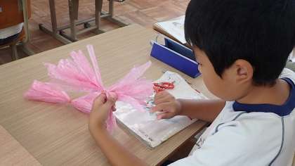 2年生は、ひらがなの「伸ばす音」を正しく書くために、音に合わせて動作を付けています。3年生は運動会で身に付ける「ポンポン」をつくっています。テープの輪っかをひとつひとつていねいに切っていました。