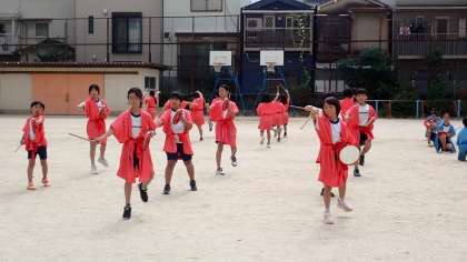 明日が雨予報のため、今日が運動場でできる最後の練習になります。4年生は、本番同様に3色の法被を着て演技の仕上げをしました。