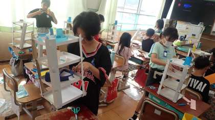 段ボールや画用紙などの材料を使って、ビー玉を転がす仕組みをつくっています。どんな風に転がしたいかをイメージして、転がる道をつくっています。何度もビー玉を転がしてみることで、どうするとうまくいくかを試しながらつくっていました。