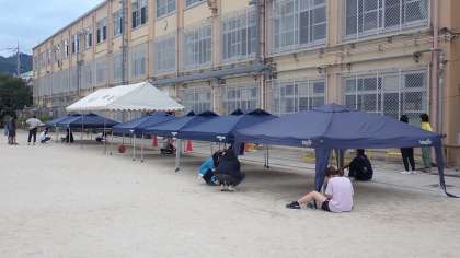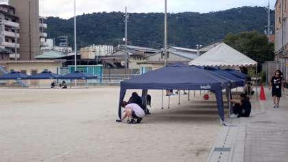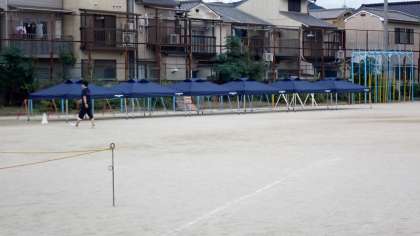 放課後は、前日に予定していた準備を一部繰り上げて行いました。運動会当日は暑くなるという予報ですので、今年度、PTAに購入いただいたポップアップ式のテントを児童席に設置します。子どもたちが運動会で全力を発揮できるように、というサポートがありがたいです。