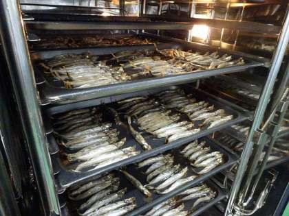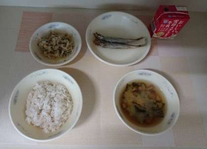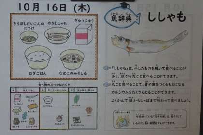「ししゃも」は骨や歯をつくるもとになるカルシウムが豊富な魚で、干したものを焼いて食べることが多く、頭から丸ごと食べることができます。スチームコンベクションオーブンで調理しているので、身はふっくらと、頭や尻尾はカリっとしています。よくかんで、頭からしっぽまで味わっていただきました。
