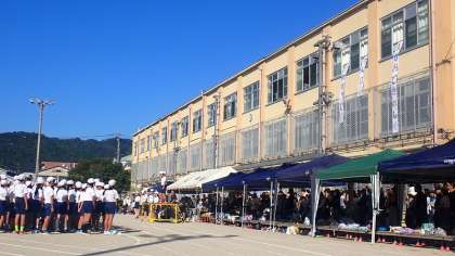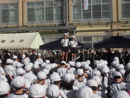 校長先生のお話に続き、スローガン発表、児童代表の言葉などがありました。今年の運動会のスローガンは、「えがおで たのしく がんばる うめキッズ」です。その後、準備運動として全校ダンスを行いました。梅津小学校の準備運動といえば、の「イロトリドリ」に合わせて体を動かし、競技に備えます。