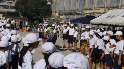 いよいよ、運動会の始まりです!と思ったところで運動会に乱入する悪者が!梅津小学校のみんなの応援パワーで悪者「イヤイヤ−」を撃退しました。今度こそ、運動会の始まりです!