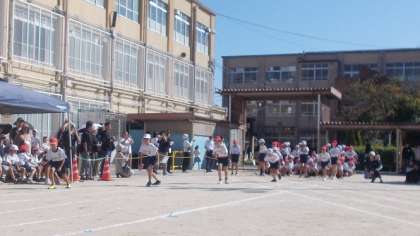 4年生は、80mを走りました。スタートピストルの合図に集中してぐっと力を蓄えて、合図と同時に勢いよく飛び出しました。はじめてのコーナーも勢いよく駆け抜けて、ゴールラインまで全力を出し切りました。