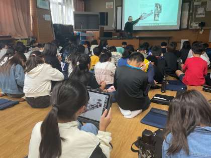 放下鉾保存会の方をゲストティーチャーとしてお迎えし、祇園祭についての学習を行いました。山鉾巡行の様子やその歴史、鉾の建て方などについて、詳しく教えていただきました。テレビや新聞ではなかなか見ることのできない貴重な映像や昔の写真も見せていただき、祇園祭への理解をさらに深めることができました。