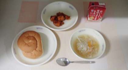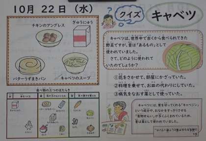 「アングレス」とは「イギリスの」という意味のフランス語です。今日の「チキンのアングレス」では、とり肉を油でからっと揚げて、トマトケチャップ・ウスターソース・さとうで作ったソースを絡めて作っています。やわらかい鶏肉の食感と、甘辛いソースを味わっていただきました。