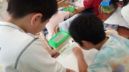 身近な生き物について、友達に伝える文章を書く学習をしています。これまでに調べたことを書いたメモや、生き物の様子を観察したことをもとに、構成メモを書いています。子どもたちの書いているものを見ると、とてもていねいにしっかり書くことができています。どんな発表になるか楽しみです。