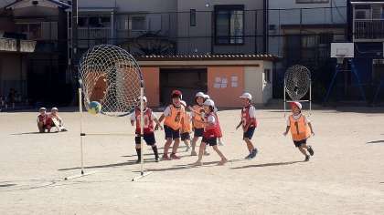 「パスゲーム」は、ボールをもって進むことができないので、ゴールするためにはうまくパスをつなぐのが大切です。パスする相手を探しているとついついボールを長く持ってしまいますが、素早くパスができるようになるとよいですね。