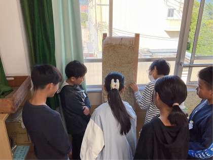 地層の「剥ぎ取り標本」の観察をしました。実際に自分の目で見たり手で触れたりすることで、縞模様になっていることや、触った感じが違う、粒の大きさが違うなどの発見がありました。