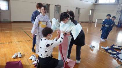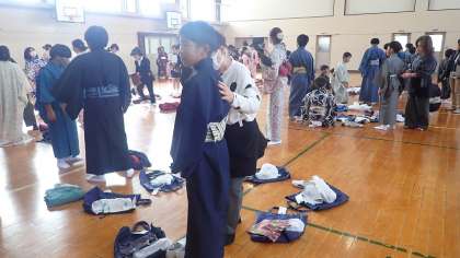 体育館で、着付け師の先生から一人一人に用意された着物を見せていただきました。なかなか見ることのない着物に子どもたちも興味津々です。さっそく、一人一人着付けをしていただきました。