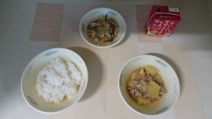 今日の「肉じゃが」は、一味唐辛子の辛さがピリッとする「ピリカラみそ味」です。いつもの肉じゃがと少し違う味付けが食欲をそそります。ボリュームたっぷりの肉じゃがを、ごはんと一緒においしくいただきました。