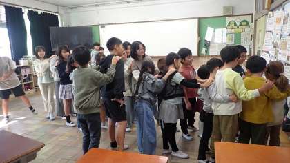 たてわりの教室に集まったら、6年生が遊びの進め方を説明します。どんな遊びをするかは、6年生が考えてきました。1年生から6年生までのみんなが楽しく遊べるように考えた遊びです。とても楽しい時間を過ごすことができたようです。