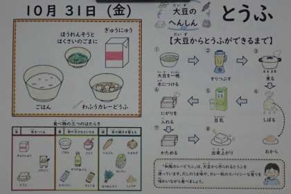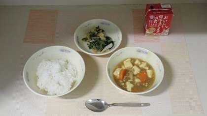 「和風カレーどうふ」は、子どもたちの大好きなカレー味の献立です。いつものピリッと辛いカレーではなくだしがよくきいており、かたくり粉のとろみもよく、ごはんと一緒にいただくとあんかけのようでとてもおいしくいただくことができました。