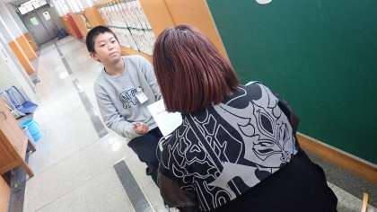 今日は、ALTの先生と英語でやり取りをする「パフォーマンスチャレンジ」をしました。これまでの学習で身に付けた英語の表現を使って、自分のことを伝えたり尋ねたりします。一対一で会話をするのはちょっと緊張するようですが、一生懸命に伝える姿が見られました。