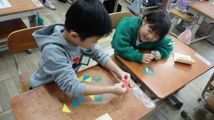 三角形の「色板」を並べていろいろな形をつくったり、友達がつくったのと同じ形を自分もつくったりしました。友達同士、やり取りをしながら形づくりをする姿が見られました。
