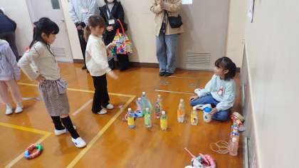子どもたちは、遊びをつくる前に廃材で思う存分遊んで、たくさんの材料でどんな遊びが作れそうかを考えをました。