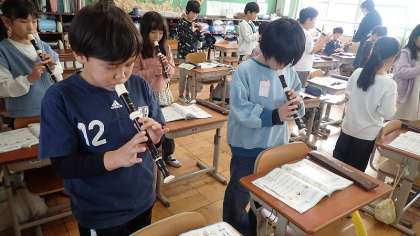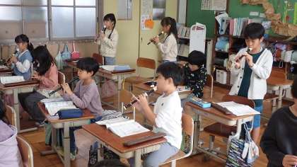 リコーダーで「メリーさんのひつじ」を演奏しました。2小節ごとや1フレーズごとに短く区切って演奏し、指づかいを確かめました。くり返し演奏することで、指づかいも身に付き、息の入れ方も上手になってきました。