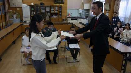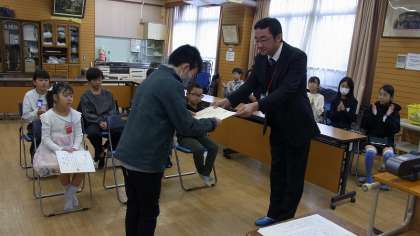 朝会のあと、校長先生から表彰を受けた児童に賞状を渡していただきました。それぞれの教室から、あたたかい拍手をおくりました。