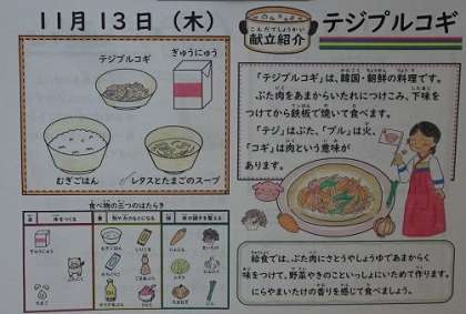 「テジプルコギ」は、韓国・朝鮮の料理です。豚肉をあまからいたれに漬け込み、下味をつけてから鉄板で焼いて食べます。「テジ」は豚、「プル」は火、「コギ」は肉という意味です。今日の給食では、豚肉にさとうやしょう油で甘辛く味を付けて、野菜やキノコと一緒に炒めてつくりました。ニラやまいたけ、にんにくの香りを感じておいしくいただきました。