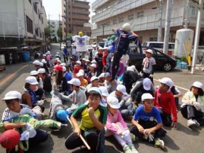 地域の方の田んぼに案山子を立てに行きました。
