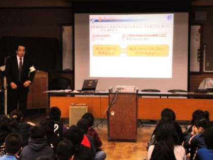 今日の自由参観の1,2,3校時に4,5,6年生が右京警察のOBの方に「心のブレーキのかけ方」について教えていただきました。やってよいこと,悪いことの判断4原則を子ども達は学習し,これからの学校生活にいかしてくれることと思います。