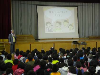 5月7日の朝。憲法についてこどもたちにわかりやすく校長先生がお話をされました。