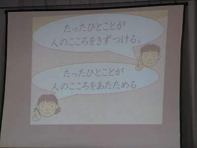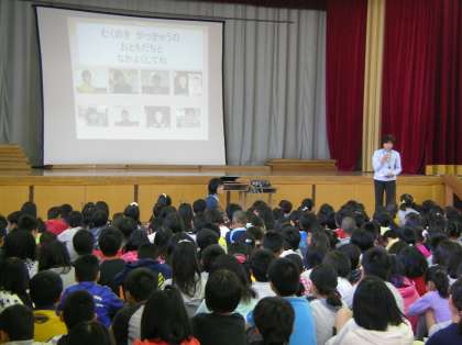 特に人権にかかわる話を中心にされました。「人を大切にすること」それは具体的にどんなことなのかなどスクリーンに絵を映しながらわかりやすく説明されました。また,むくのきのお友達の紹介もしていただきました。