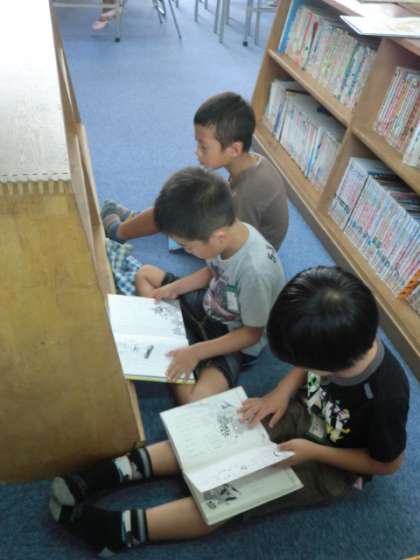 この夏図書室がリニューアルされました。図書室大好きの1年生!本を手に取り,真剣に本を読んでいます。