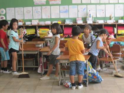 6年生にお掃除のやり方をやさしく丁寧に教えてもらっています。1年生は,できることが一つずつ増えていってうれしそうです。自分の背と同じくらいのほうきで掃くのはむずかしいね。。