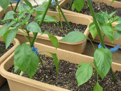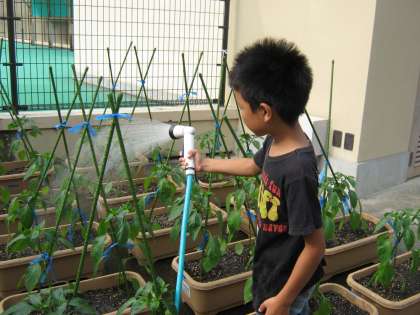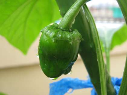 今朝の水やりのとき,小さいながらも「ピーマンの実」が出来ているのを発見しました。水やり当番の児童が歓声を上げ,これからもがんばってお世話をしようと気合を入れていました。