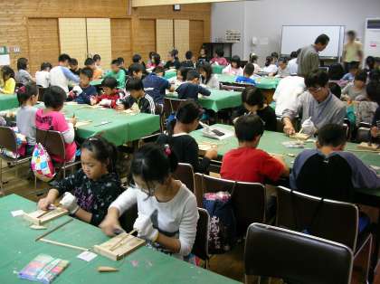 外は土砂降りの雨。研修室では「おはしづくり」に夢中の梅津小の子供たち。竹をお箸になるように少しずつ削っていきます。けがをしないようにみんな真剣な様子です。