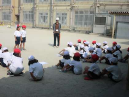 きちんと並んで,体操をします!「1・2・3・4」と元気な掛け声!準備運動はとても大切です。怪我をしないように,しっかり筋肉を伸ばしておいてね。