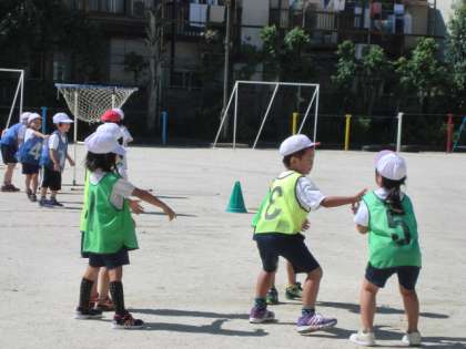 みんな大好きゲーム!ラインをひき,ゴールを出してならべ,得点,タイマーも係を決めて準備・片付け何でもします。素晴らしい!「こっち!パス!」「ヤッター,入った!」「悔しい〜負けた」と毎試合,激戦です。