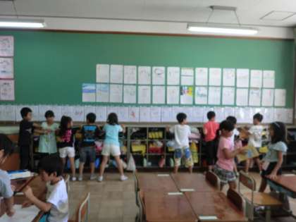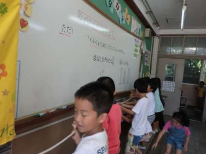 ロープ1本あれば,長いものでも,長さをはかることができます。5分間休憩中に,ロープを使って,黒板の長さとロッカーの長さを比較している子どもたち。「なるほどな〜。」とこちらが感心しました。興味をもって,自分たちでいろいろと考え学習している姿に嬉しくなりました。