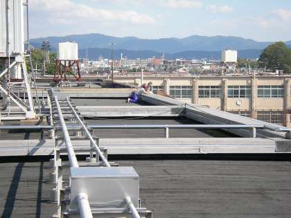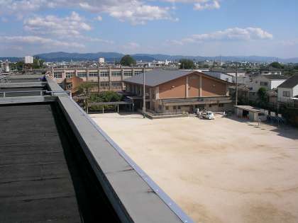 明日20日の区民運動会の準備で屋上に上がりました。万国旗の据え付け作業をしています。普段めったに上がることのない屋上からの風景を紹介します。