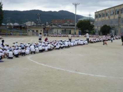 雨が降ることが予想されましたので,始業式の後は,3・4校時に予定されていた運動会の全校練習を繰り上げて1・2校時に行いました。