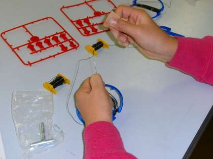 プラスチックの芯に100回エナメル線を巻きつけます。巻線の内側から線を引っ張り出し,エナメル線が絡んでしまって困ったり,「え〜と,これで何回目だっけ?」と悩んだりしながらも,何とか全員100回巻きのコイルができました。