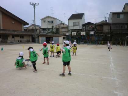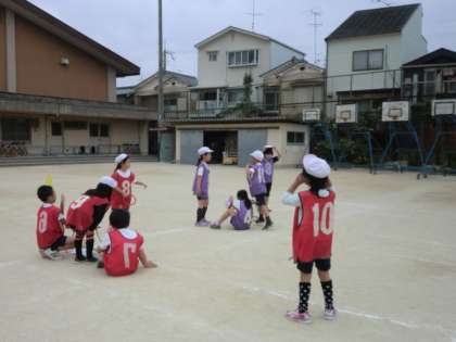 輪のバトンを持って走ります。「はい,こっち!」「リードして!」「頑張れ!」声掛けをしながら,心を一つにしてバトンリレーをしています。1年生と比べると迫力のある走り方をしています。とてもかっこいいです。