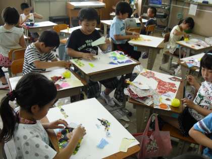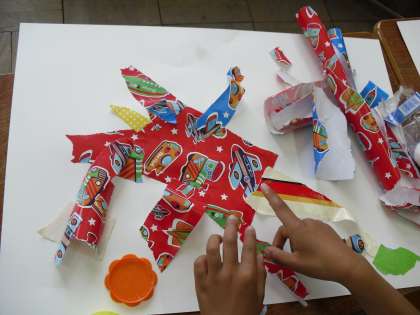 包装紙や新聞紙,毛糸にスパンコール。。。身近にある素材を使って,絵を描きました。さあ,何ができるのか?楽しみにしていると。。。「犬とお散歩」「恐竜だ!」と子どもたちの発想に驚きました。