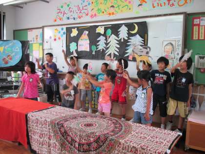 人形劇のさいごに,みんなで作った「ブレーメンの音楽隊」の歌を歌いました。
