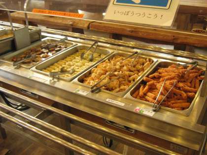 山の家の食堂での夕食です。バイキング方式(食堂では必ずですが…。)でいただきました。献立は,エビフライや揚げ餃子,生野菜,春雨,味噌汁,デザート(ももプリン?)でした。