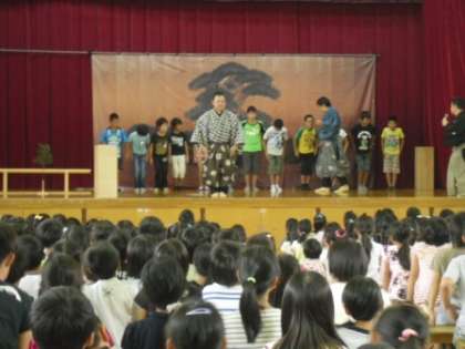 演目の後は,体験コーナーと質問コーナーでした。体験では,5,6年生の代表の人が舞台に上がり,「構え」の姿勢を教えていただいたり,セリフを言ったりしました。その後,全員で「構え」の姿勢をしたり,狂言での笑い方を練習したりしました。