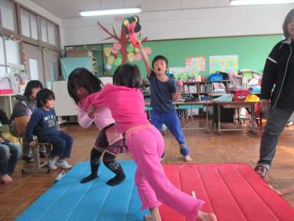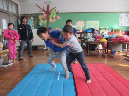 軍配を持った行司も登場し,みんな力いっぱい熱戦をくり広げました。「またしたい!」