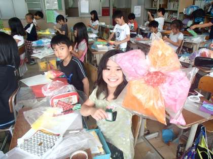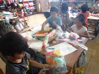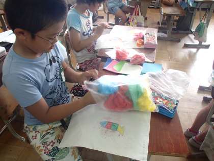 透明な袋に色とりどりの紙を入れ,袋の形を組み合わせて,自分の「友だち」を作っています。作っているうちに,イメージが広がっていくようで,最初に考えたものよりもよりよいものになってきているようです。