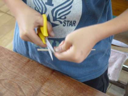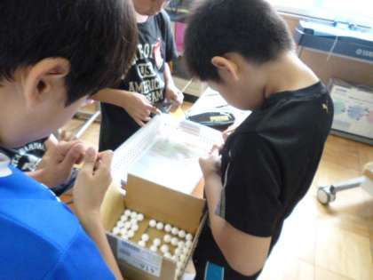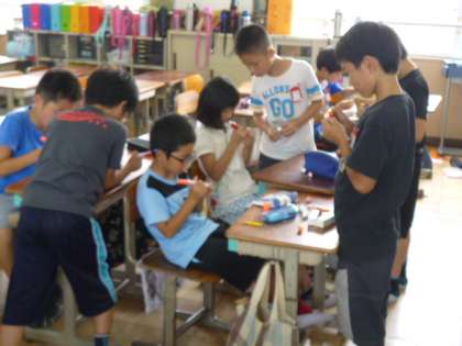 釣り担当グループは,この日は手作り浮き作りを行いました。小型の球形の発泡スチロールに竹ひごをつけ,色を塗って完成という行程ですが,子ども達は初めに決めた役割を超えて,協力し合ってこの日のノルマ「100個」を完成させました。