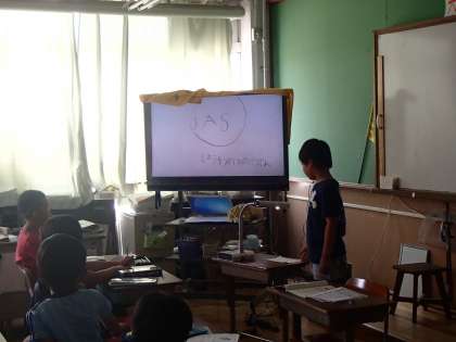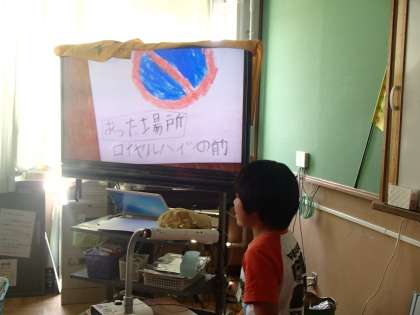 身の回りの記号について調べ,報告する文章を書く学習をしています。本時では,集めてきた記号について発表しあいました。「これ見たことある」「こんな記号どこにあるの?」など調べてきた記号に興味をもって学習をすることができました。