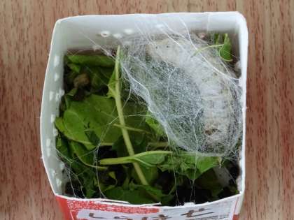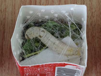 交流学級の友だちにも呼びかけて,牛乳パックを集め,風穴をポチポチとあけ,そこにはペーパータオルを敷きました。カイコは,そっくり返ったりからだをくねらせたりしなから,口から糸を吐き,上手に繭を作っていきました。子どもたちもじいっとその様子に見入っていました。