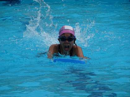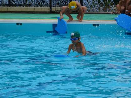 クラスの友だちと一緒なら,水の冷たさもへっちゃら。ちょっとしんどくても記録を伸ばしたくて頑張る子どもたちです。