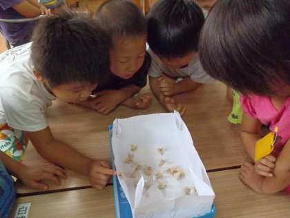 今日,学校に来ると繭の中からカイコがが誕生していました。「先生,がんばってがんばってマユの糸をやぶって,カイコががでてきた!。」うれしい声!みんな,真っ白なかいこがを覗き込んで歓声をあげました。